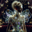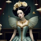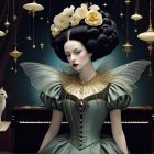 A regal figure in an elaborate green gown adorned with intricate details. Surrounded by golden sculptures and ethereal elements, she exudes a blend of elegance and mystique against a dark backdrop.