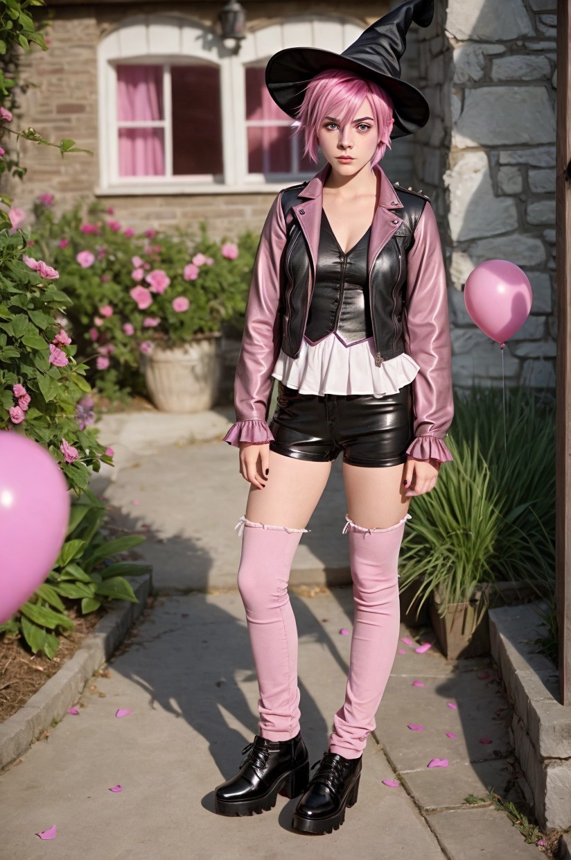Prompt: Tonks was a young witch with a pale heart-shaped face and dark twinkling eyes. She typically kept her hair short and spiky, and often bubblegum-pink.