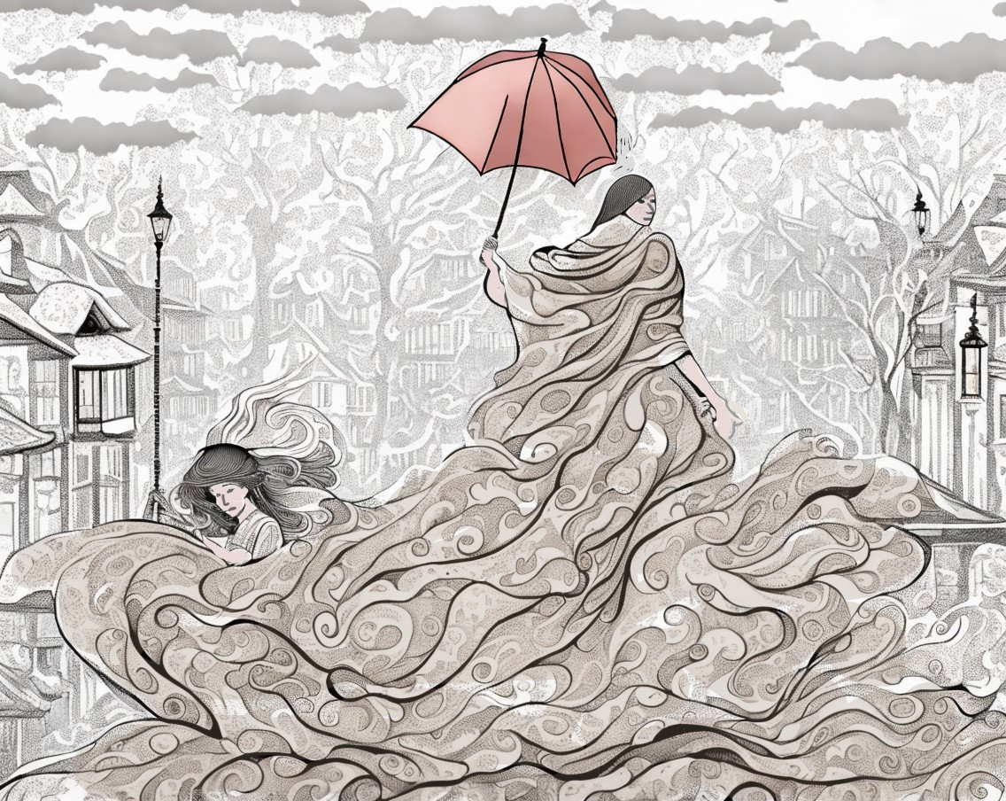 Prompt: Egon Schiele and Charles Rennie Mackintosh style. Colorful woman in an colorful oversized, long, flowing coat with a train holds a three-dimensional salmon-colored umbrella over her head, stormy rain, street of an old town, lanterns, houses, trees, raindrops from the side, flood