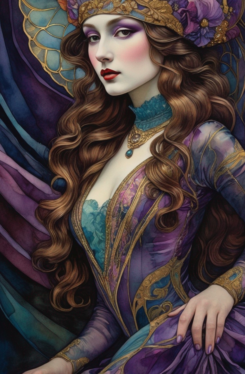 Stylized portrait of a woman with auburn hair and purple attire