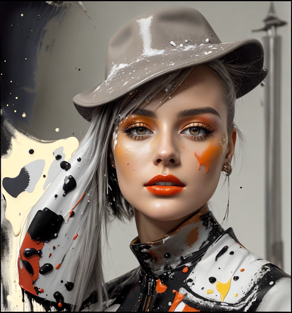This artwork features a stylish young woman with striking orange lips and flowing hair, set against a vibrant, abstract background of gray and splashes of color.