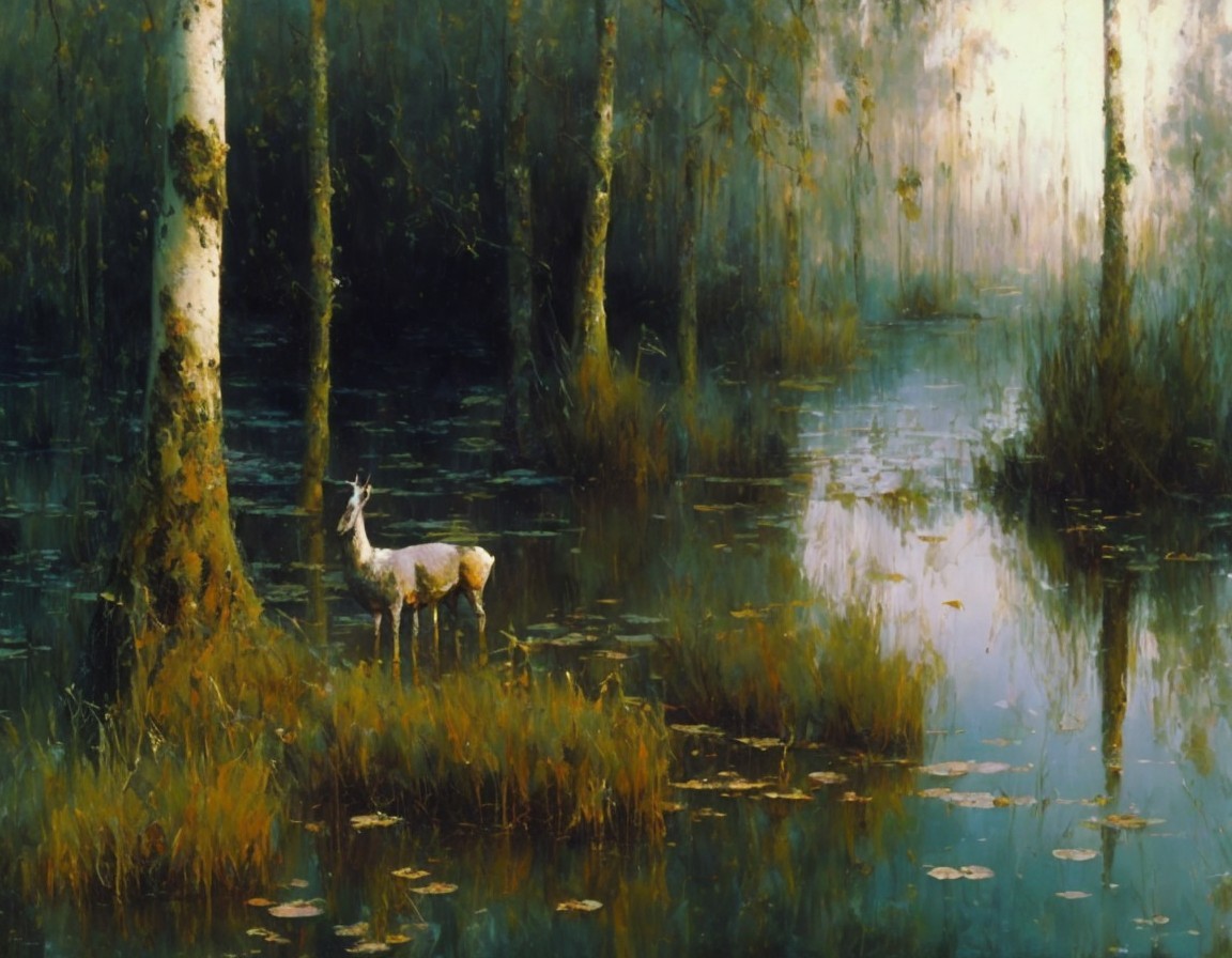 A serene landscape features a chess set floating on water, surrounded by trees. The sun casts a warm glow, reflecting on the calm surface, blending nature and strategy harmoniously.