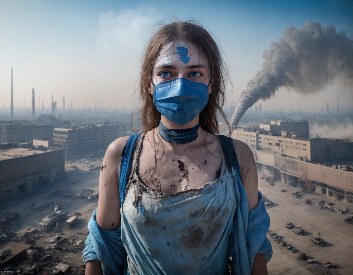Foreground: A little girl, age:5-6, wearing dirty mask, tear marks present, dirty dress and face, blue beautiful eyes