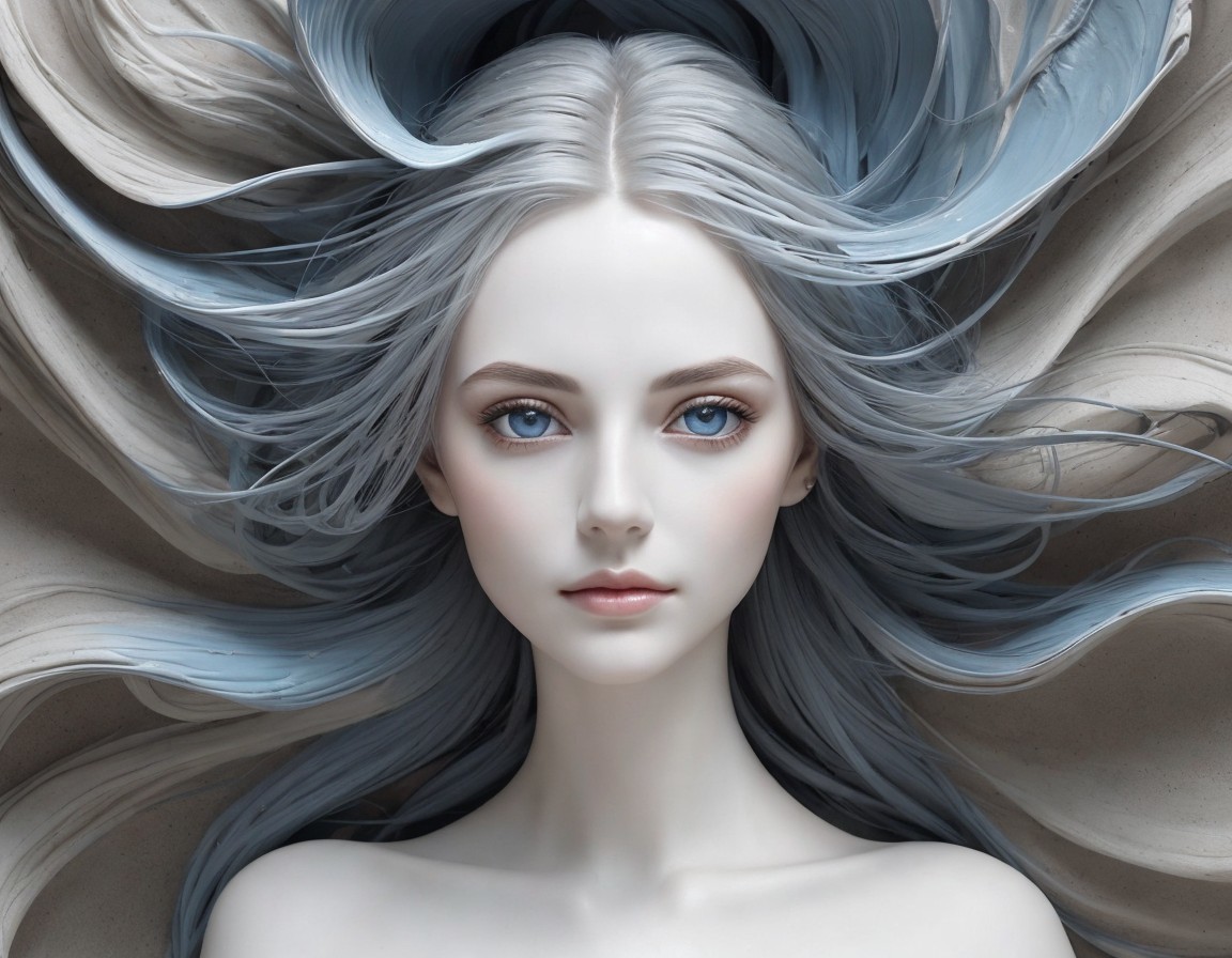 Surreal portrait of a person with cracked, earthy textures and cloud-like background, evoking a statue-like appearance.