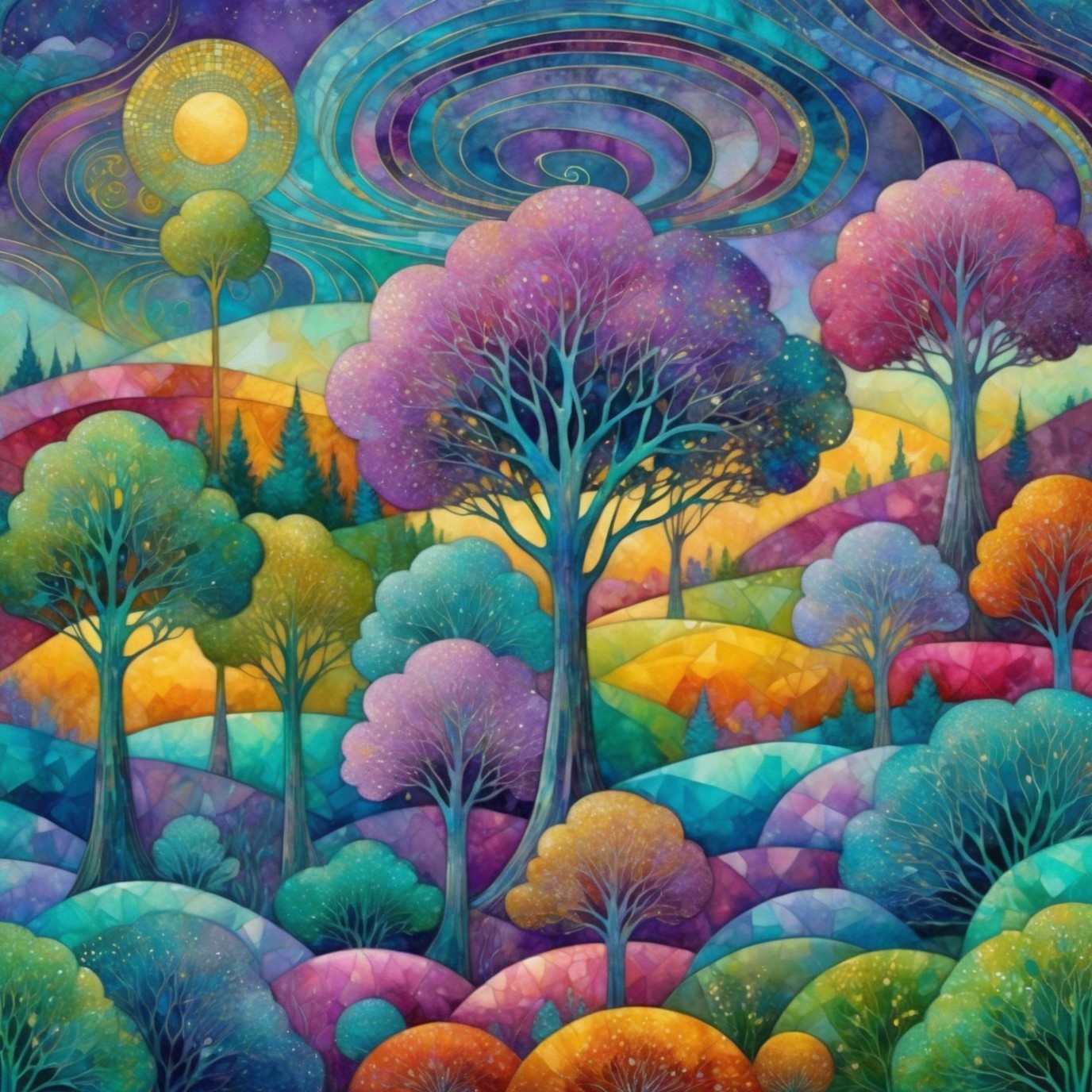 Mystical atmosphere skyline , intricate floral patterns, shimmering gold accents, mosaic patchwork background, soft watercolor textures, wet on wet technique, Klimt-inspired style, rich color palette of silver, purple. blue, teal and green. Beautiful, elegant and dreamy ambiance, Gustav Klimt's artistic flair, Artstation, high resolution for detailed brushwork and textures.Vibrant Christmas tree, ethereal and delicate, snowflakes floating in the air, shimmering like stars, night sky backdrop, deep indigo and purple hues, glowing specks of light, magical and dreamy atmosphere, close-up focus, intricate details, digital painting, whimsical and enchanting style, fantasy elements, soft and mystical lighting
