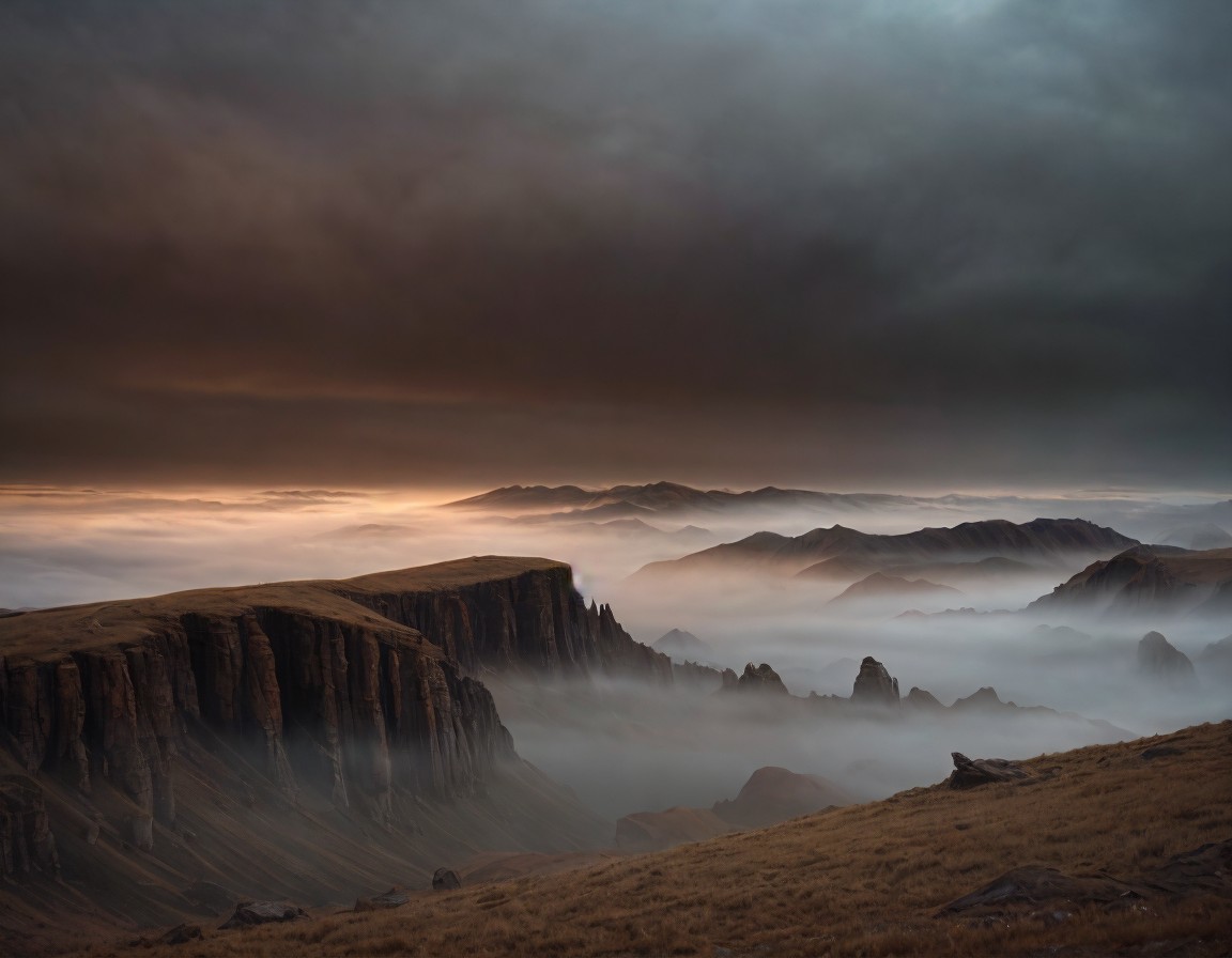 151515: [Ethereal photography of a mystical landscape shrouded in eerie ambiance, shot from above against foggy backdrop, dark golden hues, vintage flair, surrealistic vibe, reminiscent of a sci-fi film, exuding mystery; high-res, surrealism, cinematic lighting, intricate details]{Nikon Z9, 85mm F1.2 lens, intricate details, high-resolution, photorealistic quality.}