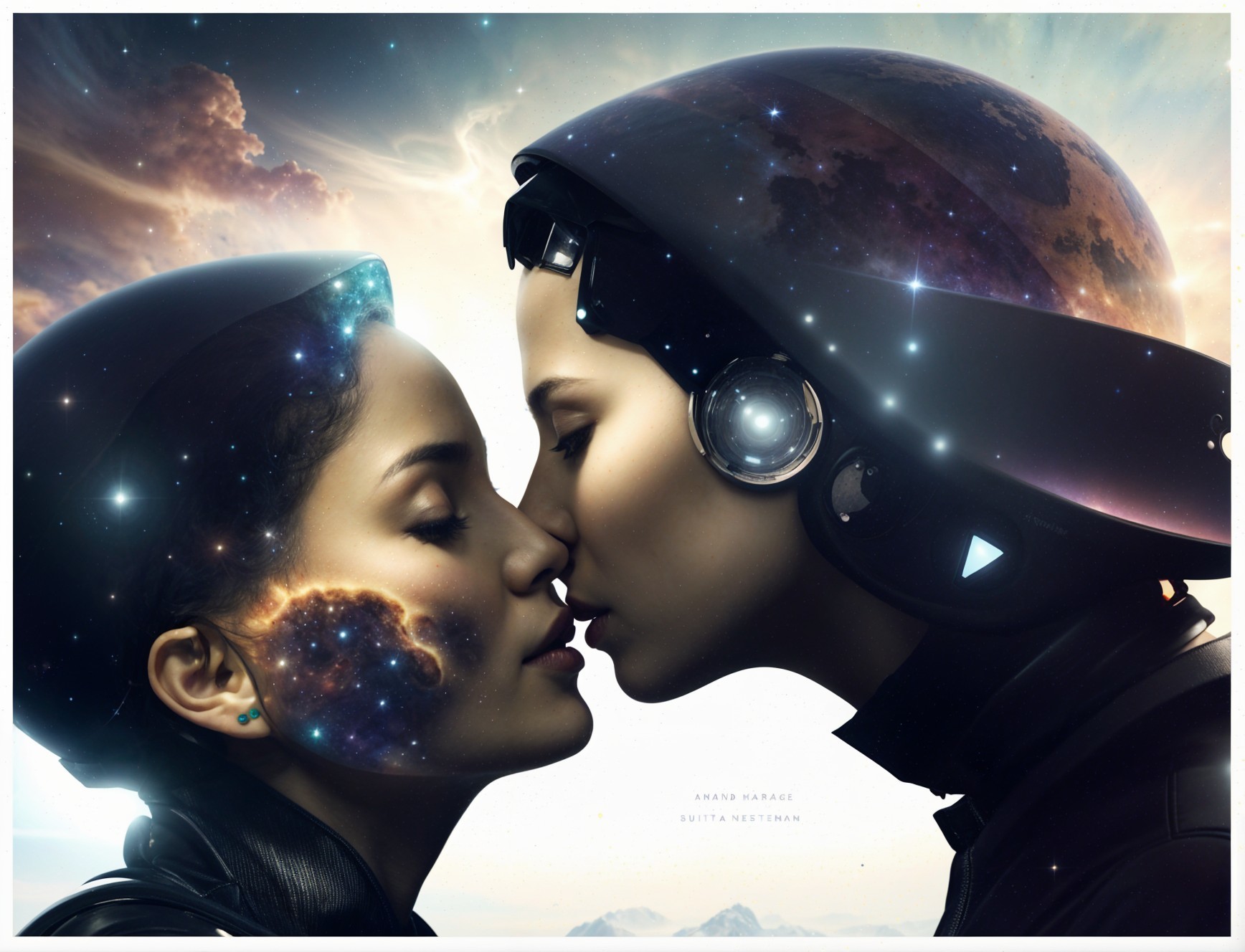 Two astronauts in sleek helmets share a tender kiss, silhouetted against a vibrant cosmic backdrop filled with stars, galaxies, and celestial colors, symbolizing love amidst the universe.