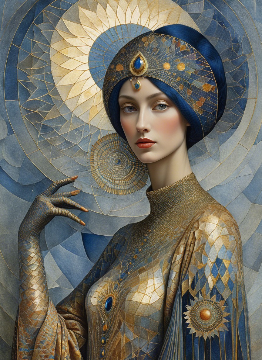 A single image, psychedelic siren, style of Alex Grey, style of Remedios Varo, style of Paul Klee, style of Leonora Carrington, eye contact, soft, beautiful delicate interplay of light and shadows on every surface, exotic, vivid, radiant, kaleidoscopic, highly colorful, most complex and highly intricate, dominant golden and indigo but colors, highly intricate and utterly complex designs and patterns, exciting. Prompt by Vishrut Abhinna.