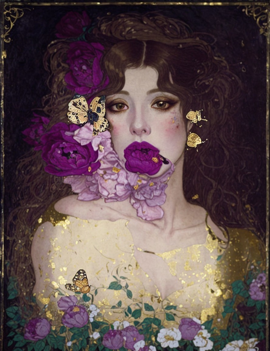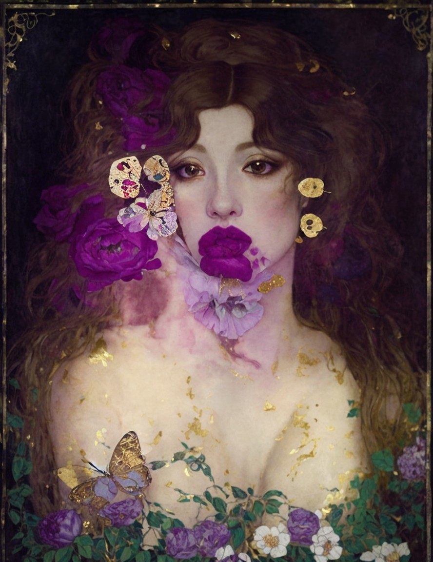 A vintage-style portrait of a woman with flowers and butterflies, conveying a whimsical and ethereal aesthetic.