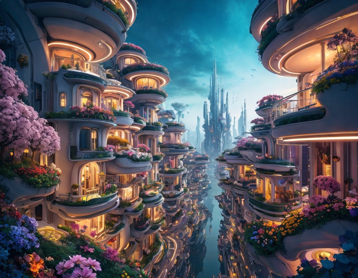 Futuristic twilight cityscape with cylindrical skyscrapers and lush terraces reflected in waterway