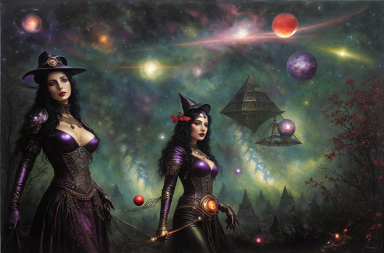 + Prompt:Witch in sensual portrait, natural beauty of cosmic witch, red metal bomb with face, cosmic purple smoke, astronomy photo background, green mist and orb of gold, stars, orbs, red lace, steel leather, cybernetic clothes, wire mesh suits, interesting atmosphere pyramid of Giger.
