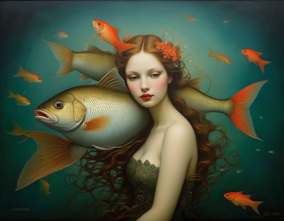 A serene woman with wavy hair is surrounded by floating goldfish, including a large one she gently cradles.