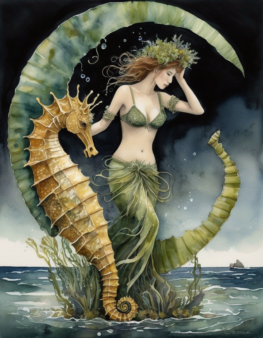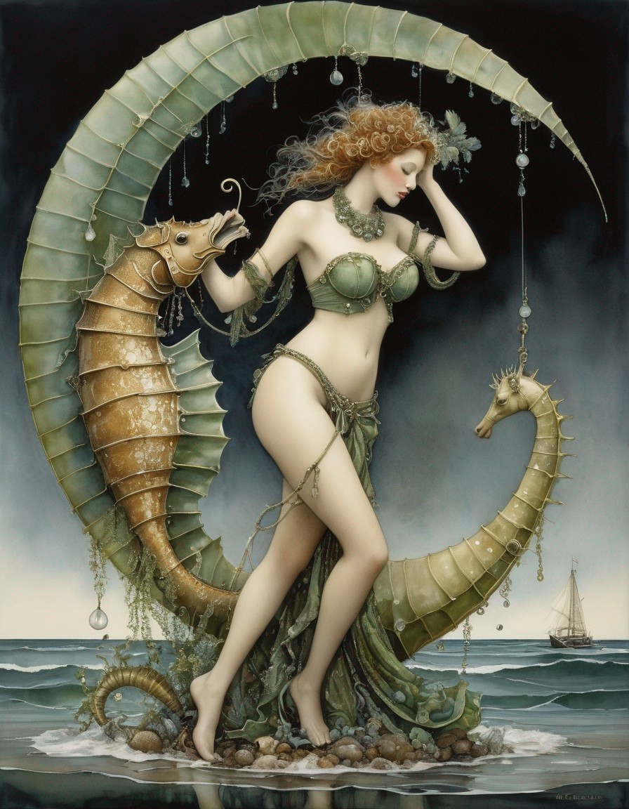 An armored seahorse knight stands onshore, holding a seashell shield, with a moody ocean backdrop.