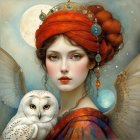 A stunning portrait of a woman with an elaborate orange headdress featuring a flamingo. She has striking makeup, delicate earrings, and poses with another flamingo against a softly glowing backdrop.