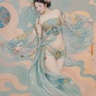 A graceful figure in flowing, pale green garments adorned with delicate patterns, set against a soft, swirling background. The elegant attire highlights traditional beauty and artistry.