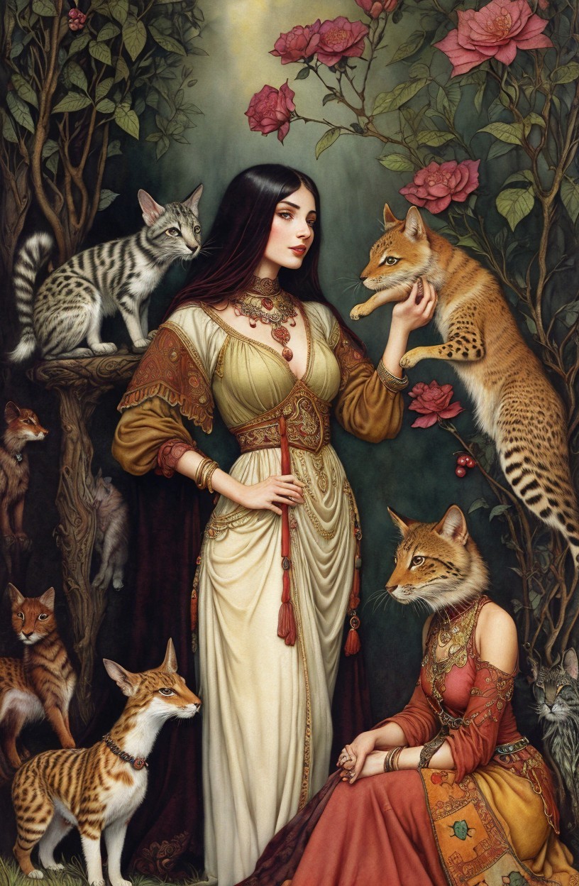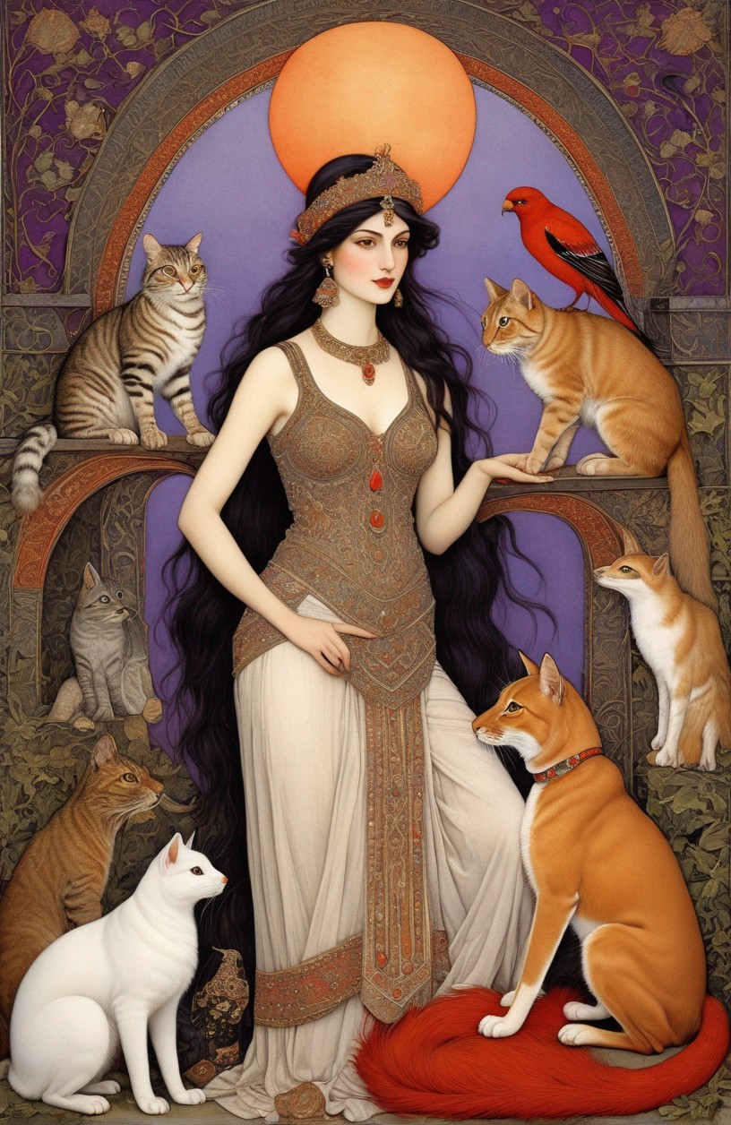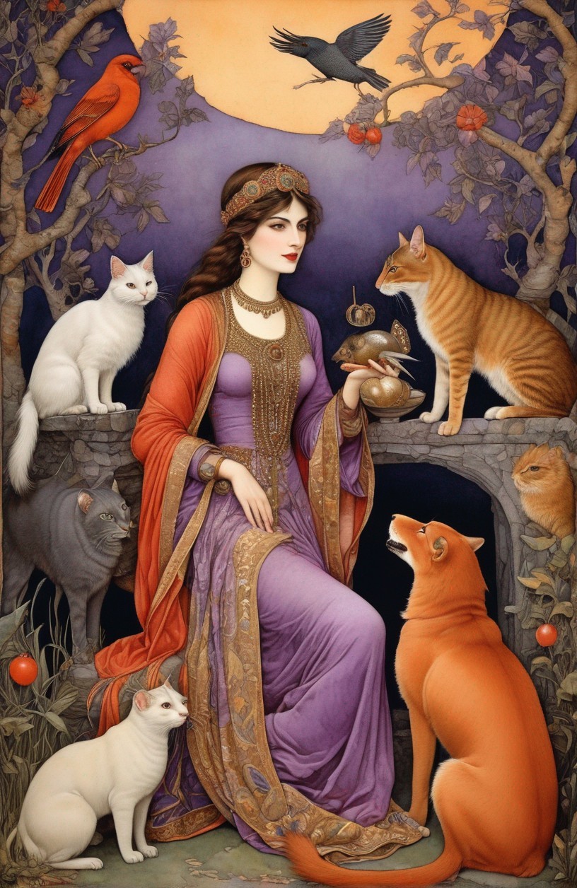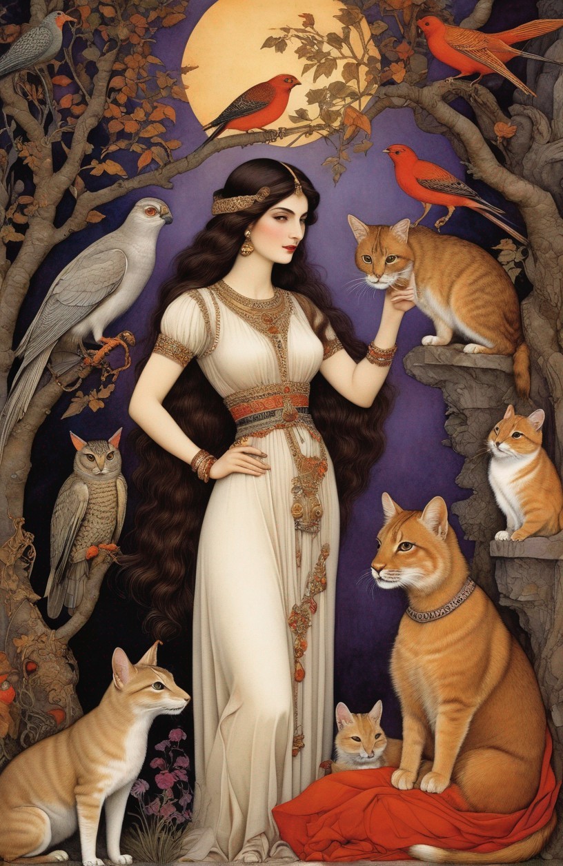 Regal Woman in Traditional Attire with Cats and Moon