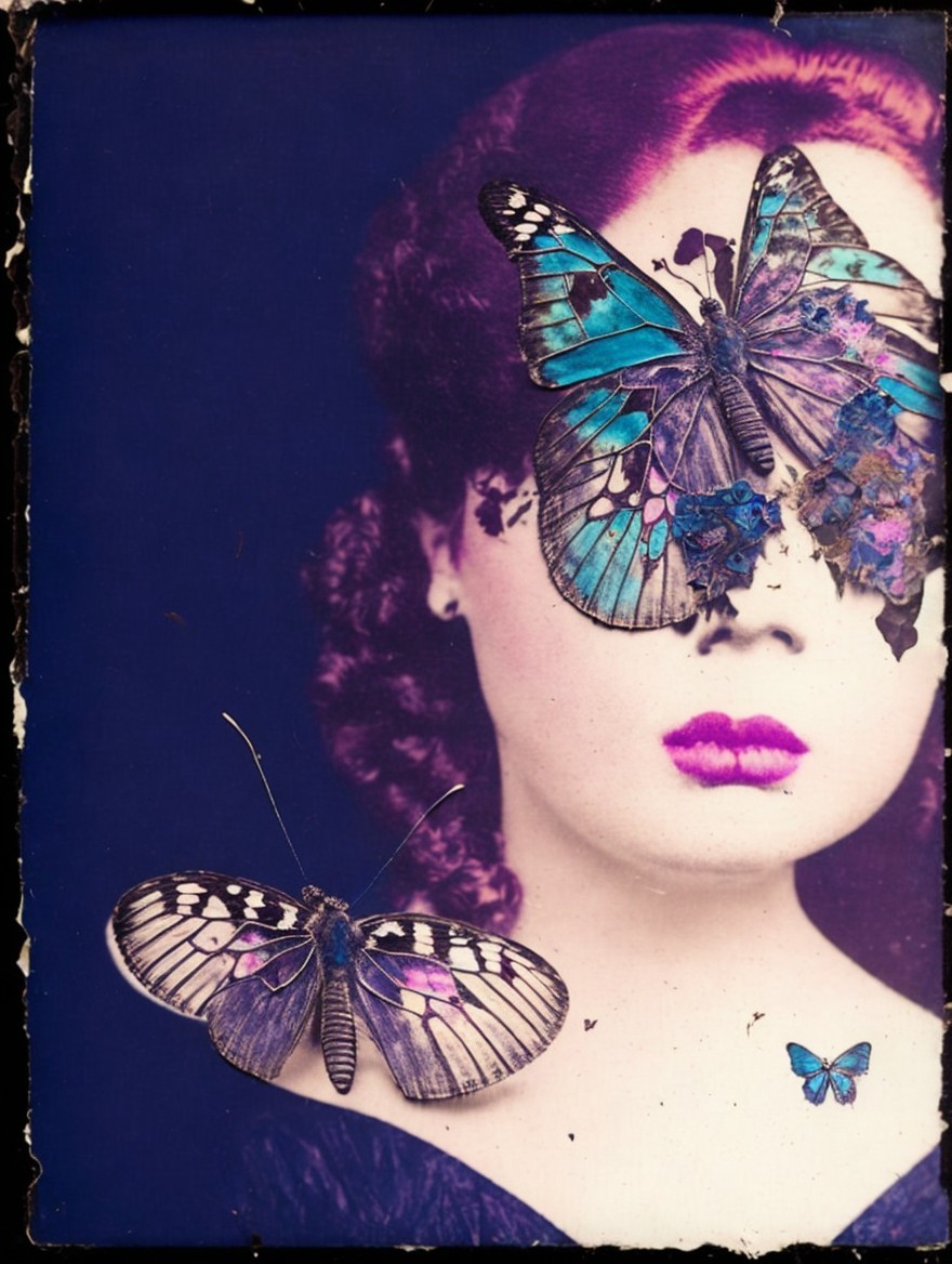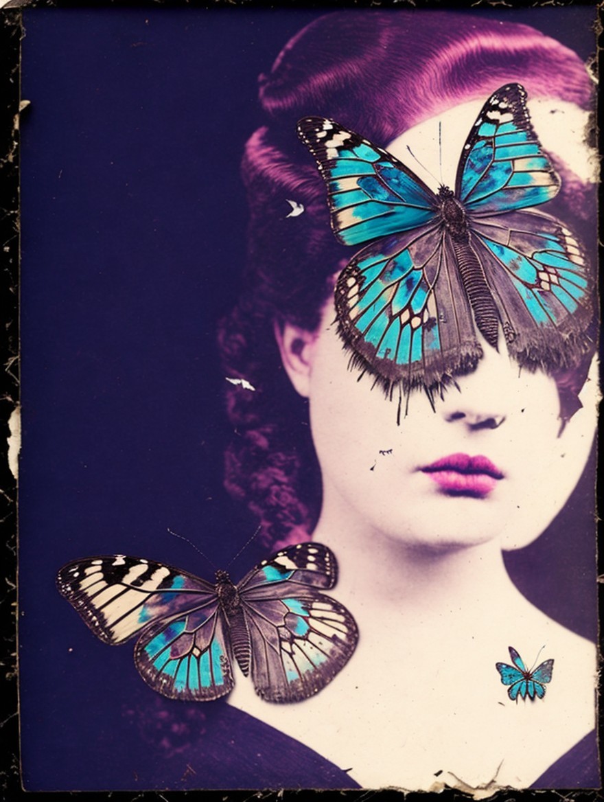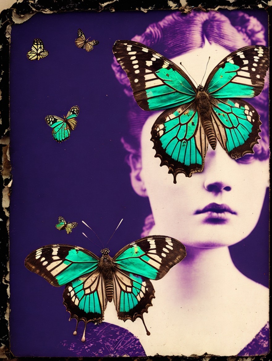 A vintage-style image with a woman and vibrant turquoise butterflies on a purple background.