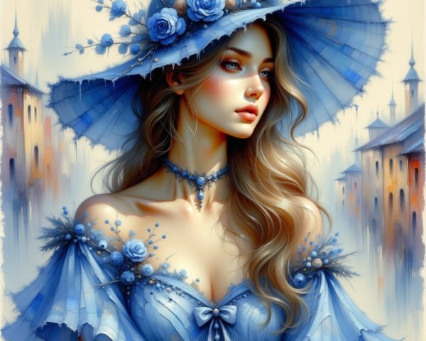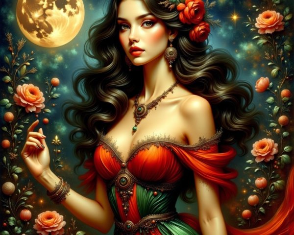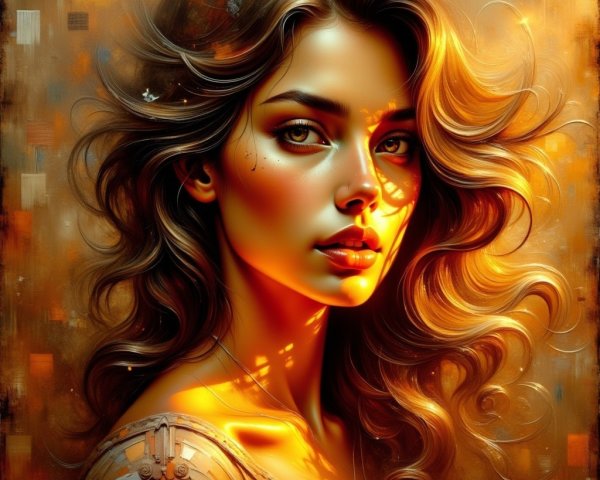 A young woman with long, flowing hair stands in front of a serene ocean backdrop. She gazes softly at the viewer, surrounded by palm trees and a vibrant sunset sky.