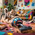 A playful cat leaps over a quirky vacuum cleaner with a monster design, surrounded by scattered snacks and colorful splashes on the walls, creating a lively and chaotic living room scene.