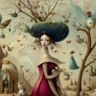 A whimsical, dreamlike scene featuring a serene figure with an elaborate, blue-haired crown, surrounded by birds, trees, and fantastical elements, evoking a sense of magic and wonder.