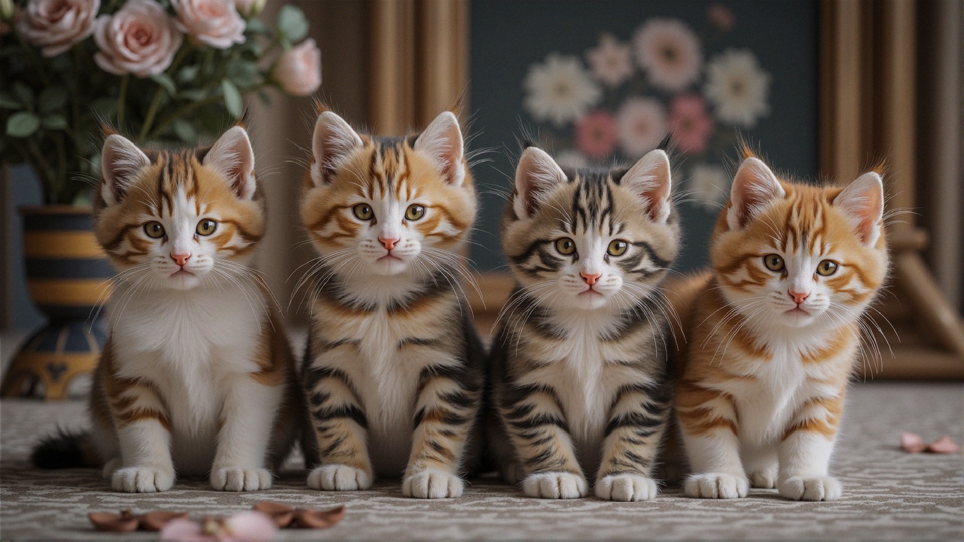 Four adorable kittens sit closely together, each displaying unique fur patterns of orange and gray stripes. Their big, expressive eyes and playful demeanor make for an irresistible sight, set against a floral backdrop.