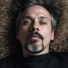 A man with a relaxed expression lies on a textured, fluffy surface. His eyes are closed, and he has tousled hair and a trimmed beard, conveying a sense of calm and serenity. Or in other words - man falling asleep in the loving embrace of Chewbacca!