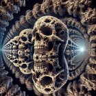 A surreal scene features intricately designed skulls within a cavernous space, illuminated by a radiant light. The environment blends organic shapes with mechanical elements, evoking a sense of mystery.