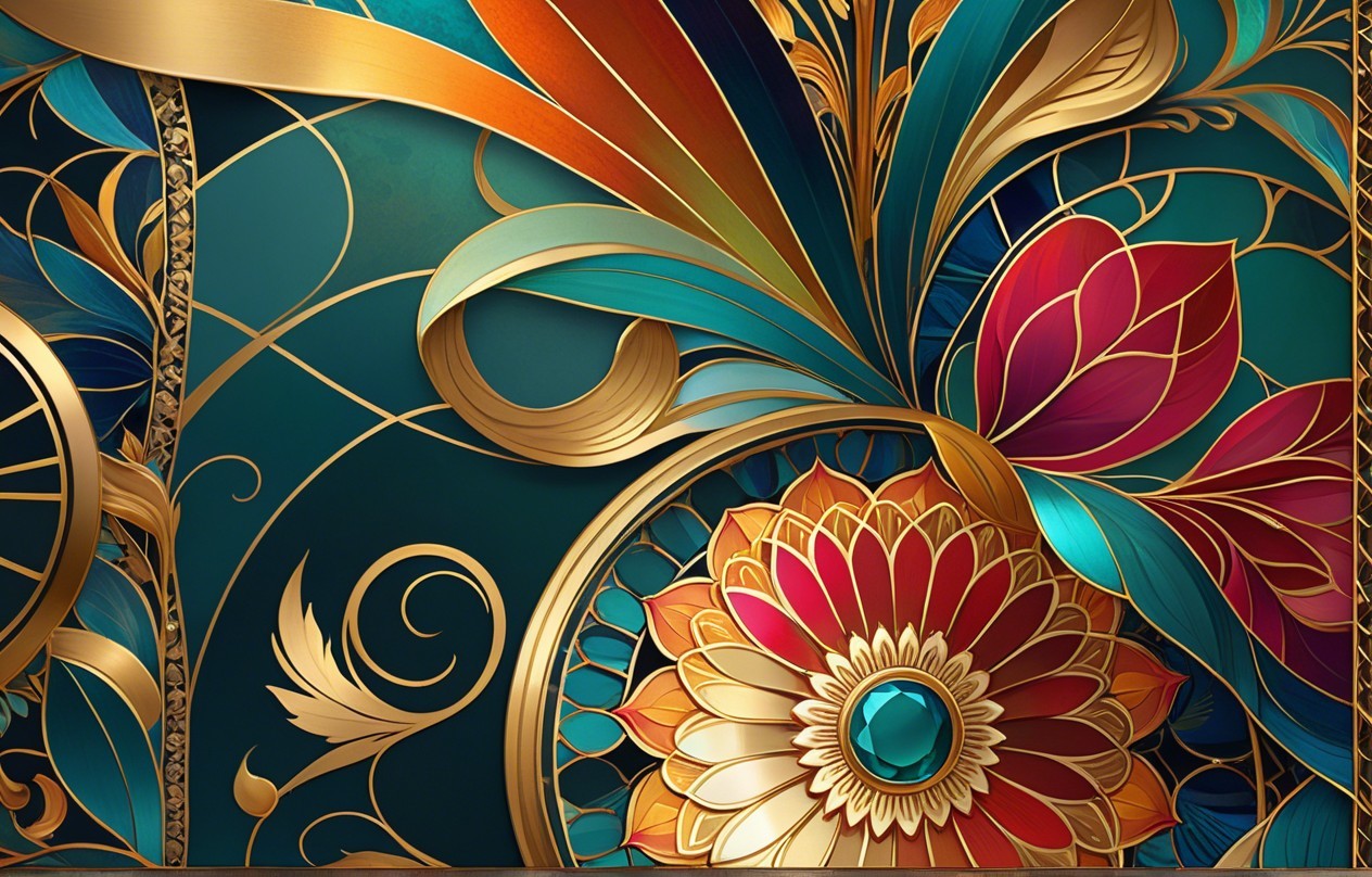 Intricate mandala design, vibrant colors, geometric patterns, floral motifs, ornate details, symmetrical layout, digital art, high resolution, detailed linework, rich color palette, golden accents, intricate filigree, Eastern-inspired elements, luxurious textures, mystical and enchanting ambiance, glowing gemstones, soft ambient lighting, fantasy-inspired, Art Nouveau influence, by Alphonse Mucha, Behance.