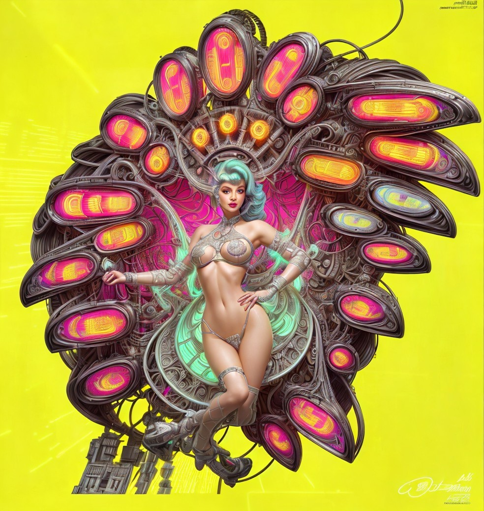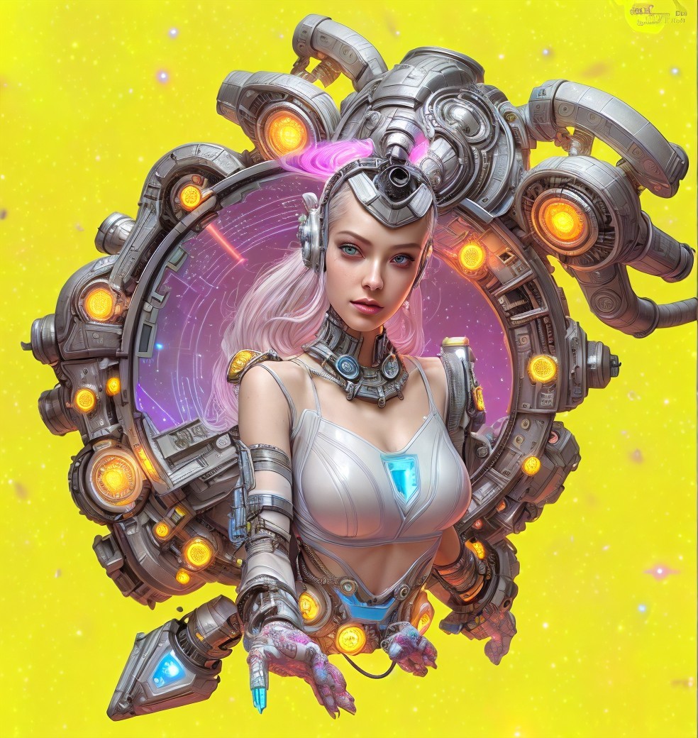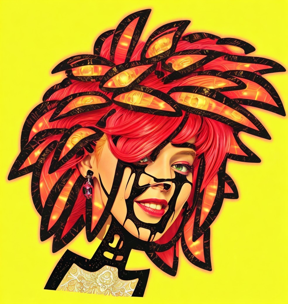 Colorful illustration of female character with pink hair and blue eyes in golden armor and tattoos on abstract background