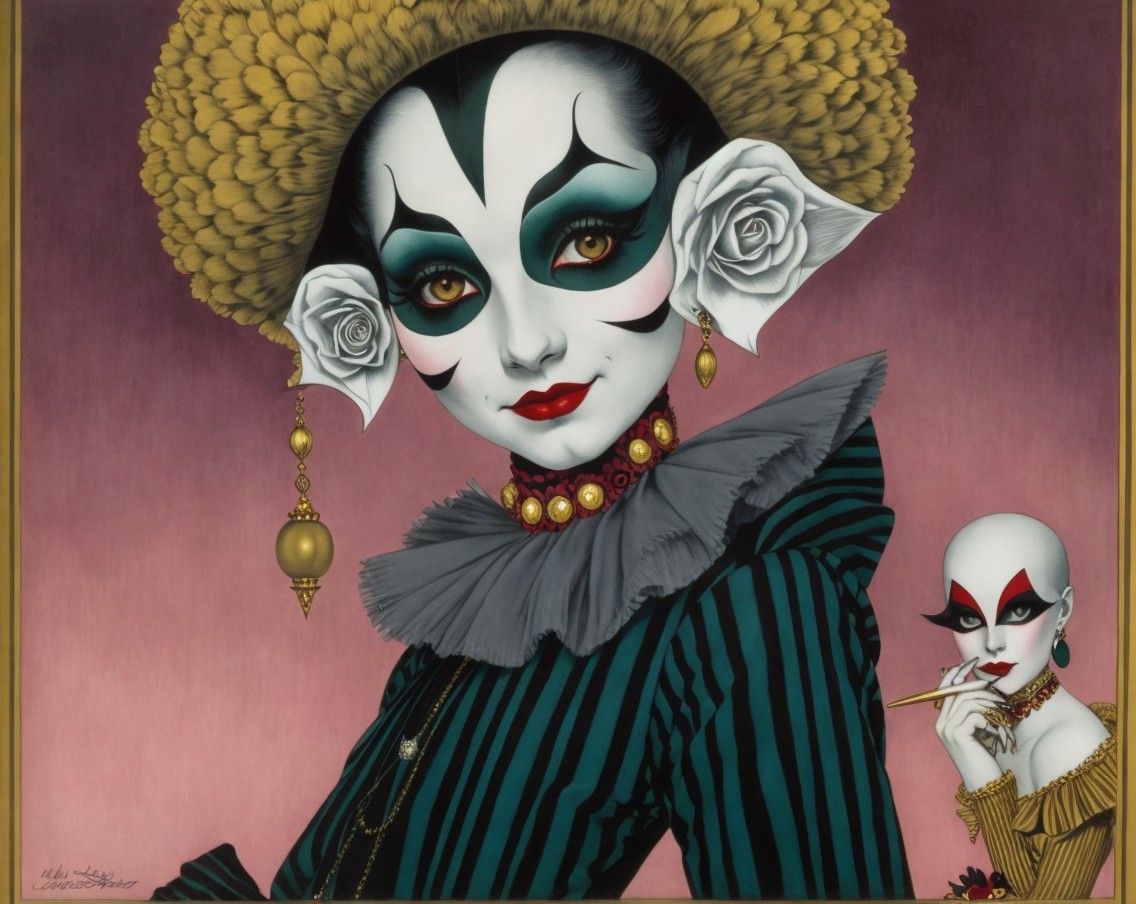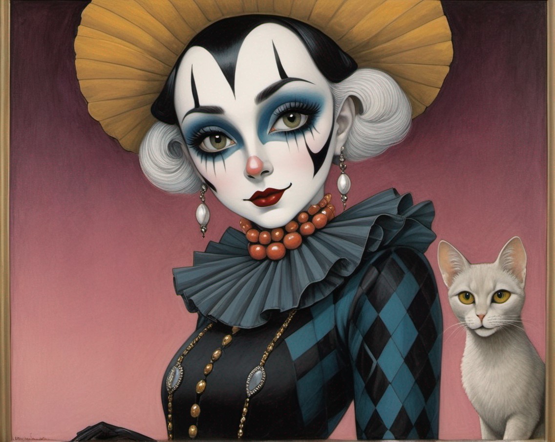 A stylized portrait of a person with an elaborate headpiece, dramatic makeup, a ruffled collar, and a cat beside them.