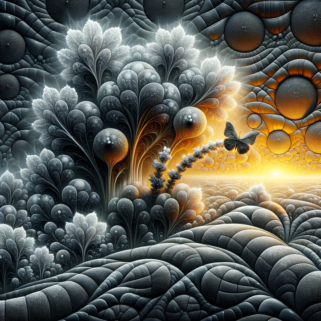 A vibrant sunset illuminates a serene landscape, featuring delicate white flowers and a graceful butterfly. The waves of color and light create a tranquil, dreamlike atmosphere.
