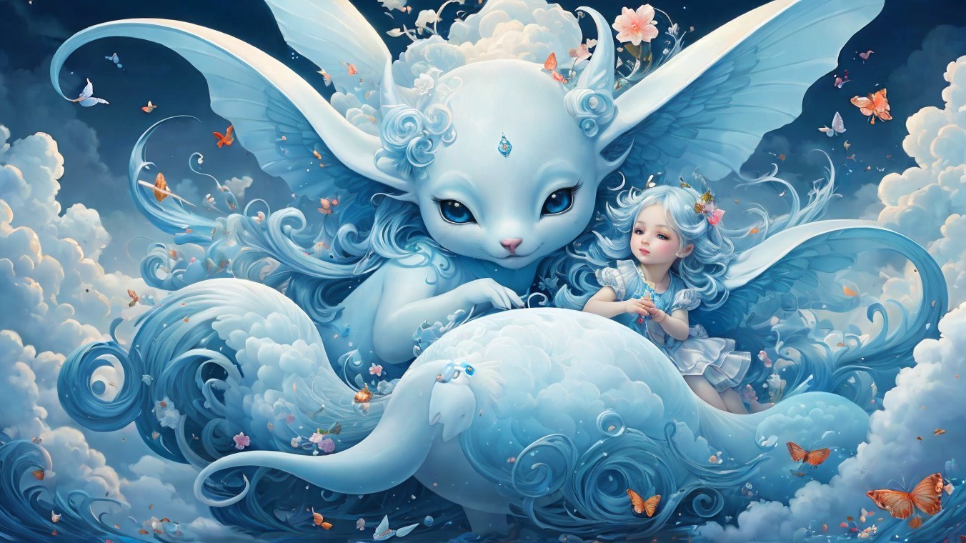 A whimsical artwork featuring a tiny fairy seated on a giant, serene blue cat-like creature surrounded by butterflies and clouds.