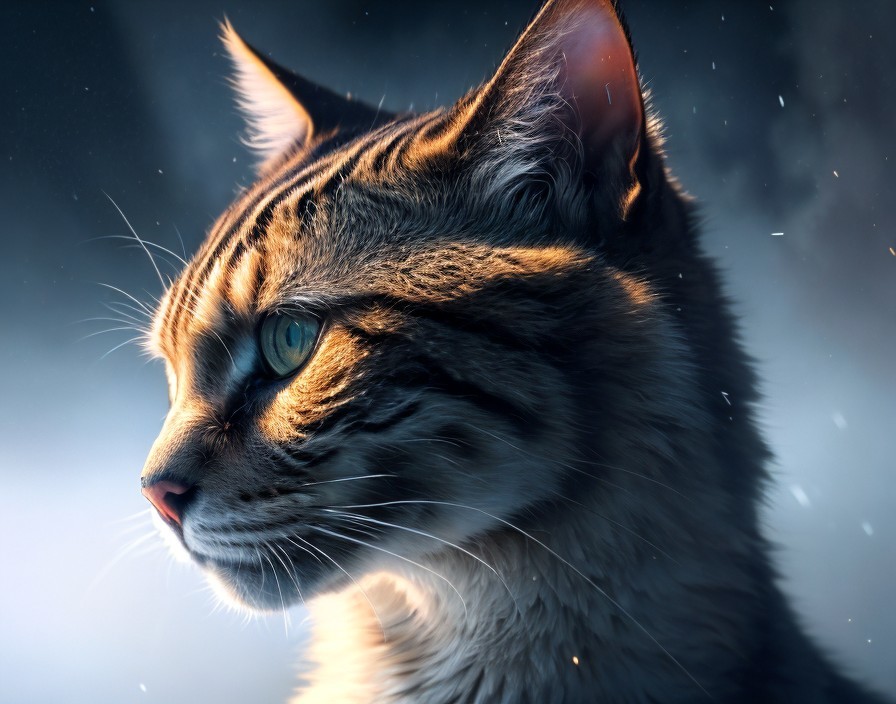 A close-up of a majestic cat's profile, featuring striking stripes and vibrant green eyes. The background is ethereal, with a blend of dark and soft light, enhancing its regal appearance.