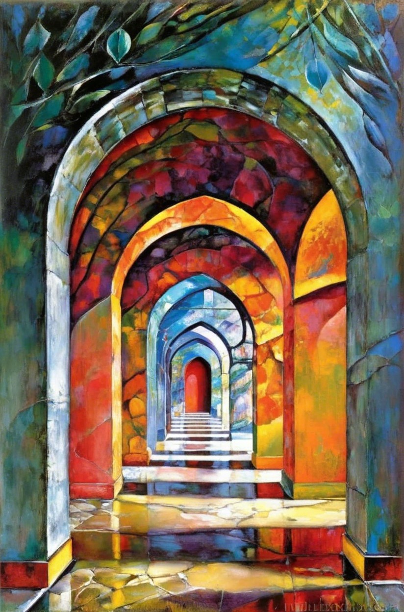 Pillars passage with round arches, colourful, Style: Zdzisław Beksiński, Picasso, naive art, Henri Matisse, Alex Grey, SALVADOR DALI, Andy Warhol, Paul Gauguin, Claude Monet, Gustav Klimt, Ernst, Ludwig Kirchner, Tim Burton, graffiti, zentangle, Marc Chagall, Jackson, Pollock, Francis Bacon, Egon Schiele, Georges Seurat M.C. Escher Joan Miró, art brut, Odilon Redon, Remedios Varo, primitivism, abstract expressionism , psychedelic