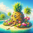 A vibrant, surreal beach scene features a whimsical, oversized pineapple-shaped house surrounded by palm trees, colorful flowers, and tranquil waters, with stylized clouds in the sky.