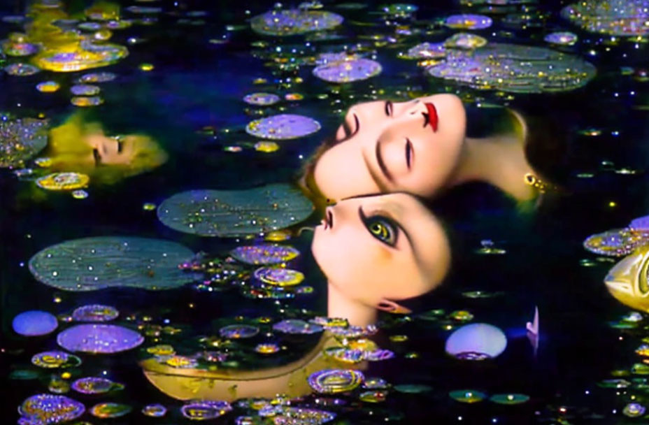 + Prompt:A mermaid swimming on the surface of a lock, Scottish landscape in the background, nighttime, night sky full of stars, crescent moon, stars reflected in the water of the loch. In the style of Georges Méliès, Harry Clarke and the Pre-Raphaelites.