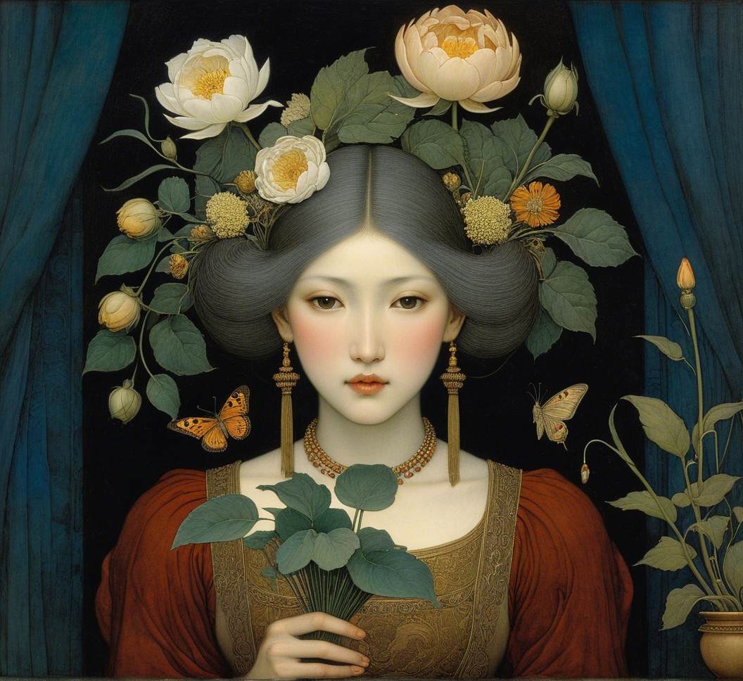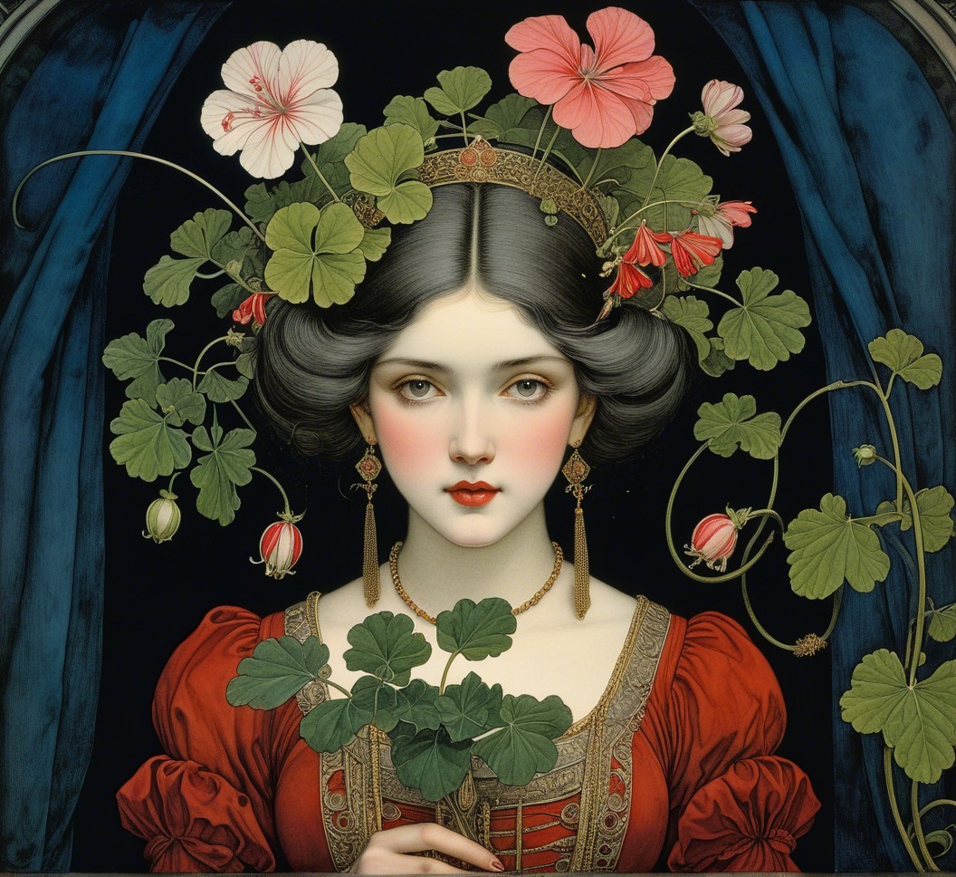 A young woman in a red dress holds green leaves and flowers. Her hair is adorned with vibrant blossoms, creating a harmonious blend of nature and elegance against a dark background.