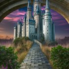 A vibrant, dreamlike castle rises against a colorful, swirling sky. A winding stone path leads toward its majestic towers, surrounded by lush greenery and an enchanting atmosphere.