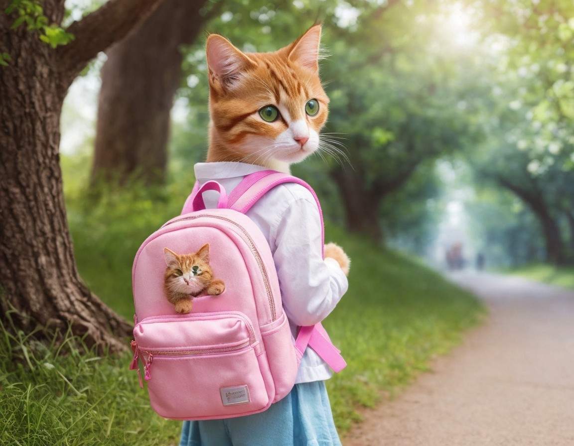 An anthropomorphic cat wearing a school uniform and backpack, with a kitten in the bag, stands on a woodland path.