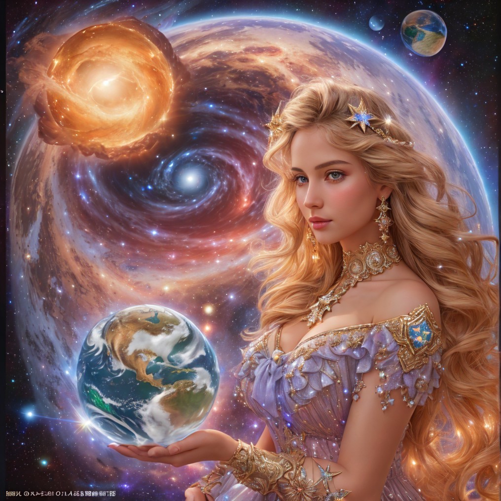 A beautiful star Maiden holding an earth globe in her hands against the background of a shining universe in the swirls of galaxies, award winning, clearly drawn hands, clearly worked out details, high definition, ultra-clear image, ultra-confusing, ultra-pronounced detail