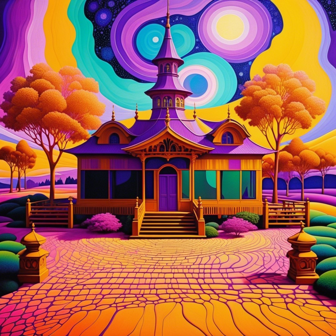 A vibrant, impressionistic scene featuring a colorful house with a spire, surrounded by autumn trees. A winding path leads to the entrance, under a swirling sky of vivid colors.