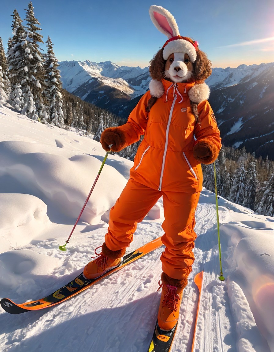 Prompt: "Anthropomorphic, humanoid: easter bunny big brown humanoid Poodle, wearing an orange ski dress, orange ski clothes, orange boots on feet, wearing gloves, winter feeling, winter sunlight, standing on a beautiful Mountain, yellow flowers, red flowers, pink flower, plants, (anthropomorphic), humanlike, anthropoid, anthropomorph, chimera, full body, head to toe, (no human face)"