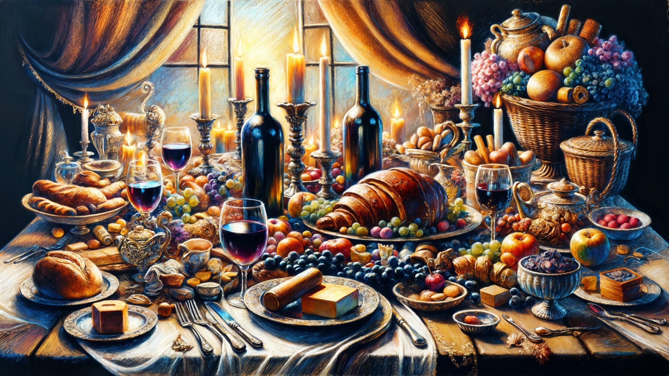 A lavish banquet scene features a golden turkey, assorted fruits, bread, cheeses, and bottles of wine, all set against a picturesque window view with colorful flowers and rich fabrics. 08.2025.