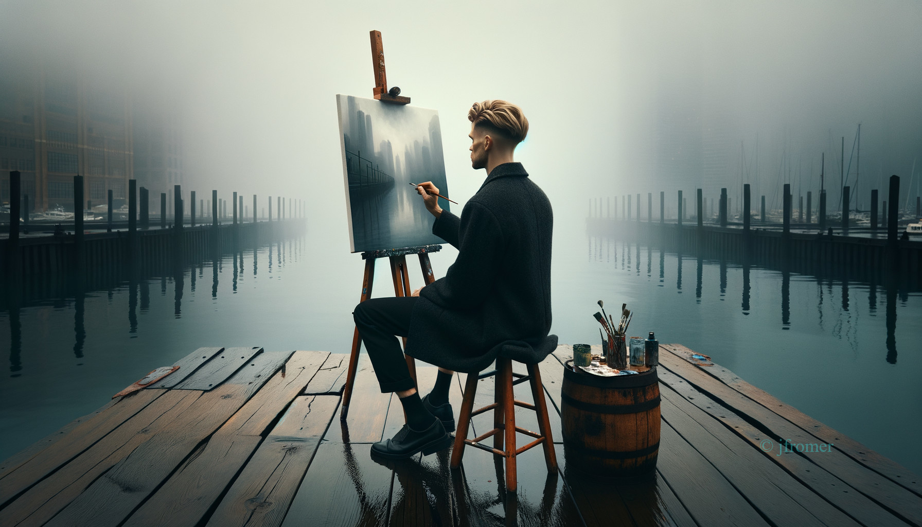 An artist sits on a stool by tranquil waters, painting on a canvas amidst a misty dockscape.