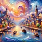 A whimsical scene depicts charming wooden buildings resembling boats, surrounded by serene waters. Dramatic clouds and a colorful sky create a vibrant, enchanting atmosphere.