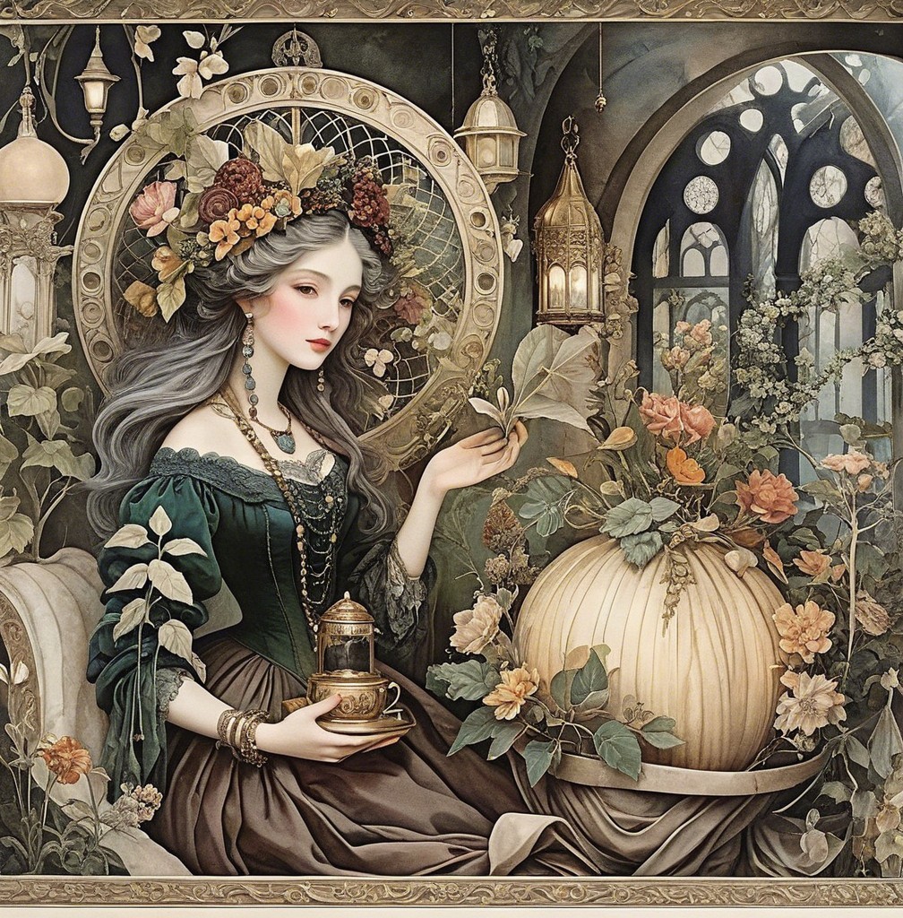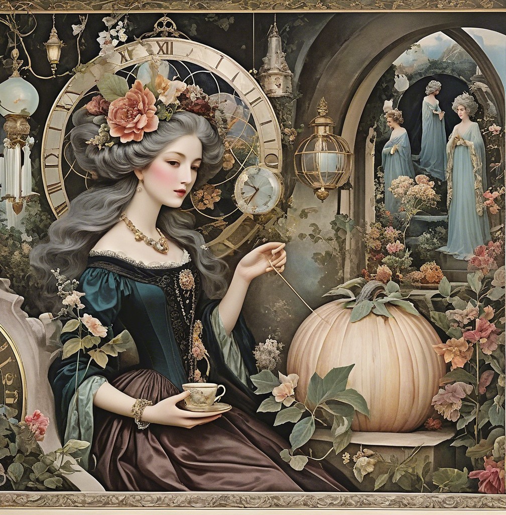 The image features a surreal composition of flowing, ornate patterns and vibrant colors. A graceful figure with elaborate hair and jewelry emerges amidst cosmic swirls and ethereal landscapes.