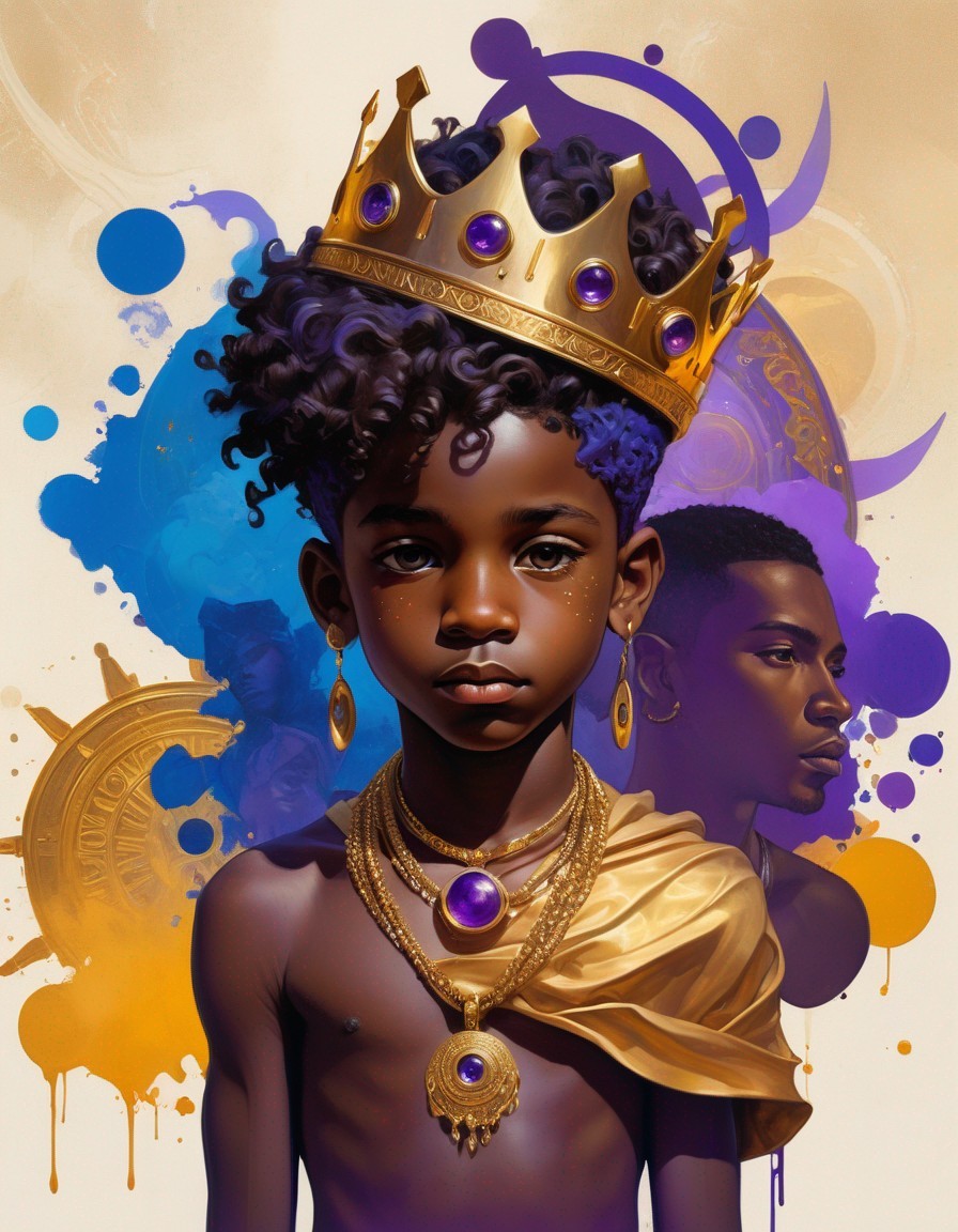 Painted image of a young dark skin melanated young African American boy king, big brown soulful eyes, strong facial features, third eye pendant, royal blues purples and gold, splash background, highly detailed accurate and proportional features, 3d shading, Alphonse Mucha, Julie Bell astral intricate infinity elemental liminal photorealistic spacecore cyberpunk
