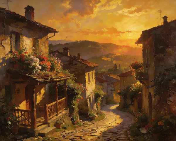 A vivid sunset casts a warm glow over a field of roses. One striking red rose stands tall amidst softly blurred flowers, creating a serene and magical atmosphere.
