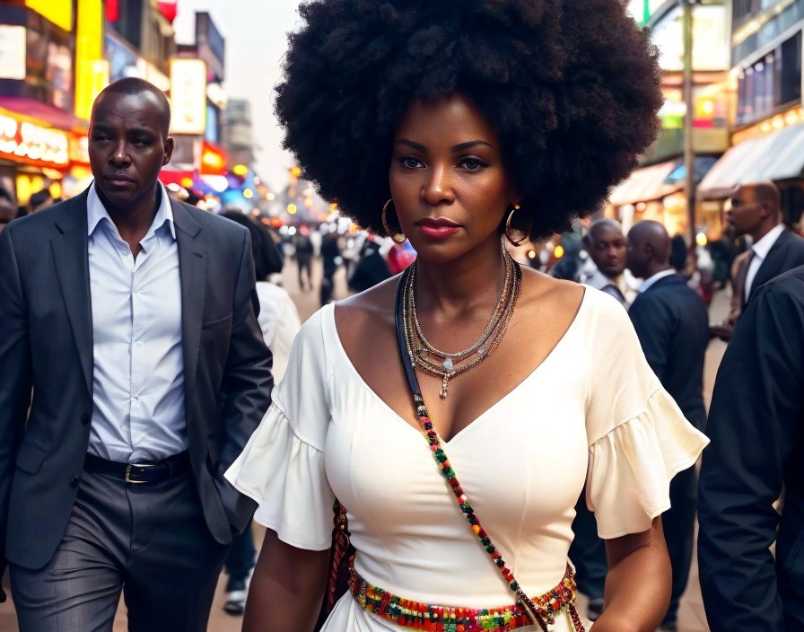 A woman with a large afro and colorful necklace smiling in a busy city street, surrounded by people, including men in suits.