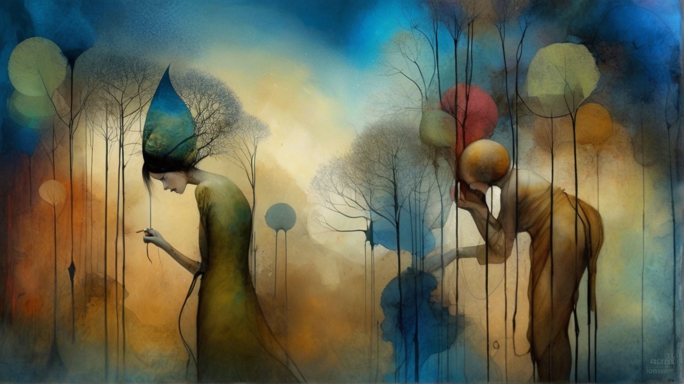 Two ethereal figures stand in a surreal landscape, their heads adorned with abstract, tree-like structures. A gradient of warm and cool colors surrounds them, enhancing the dreamlike atmosphere.